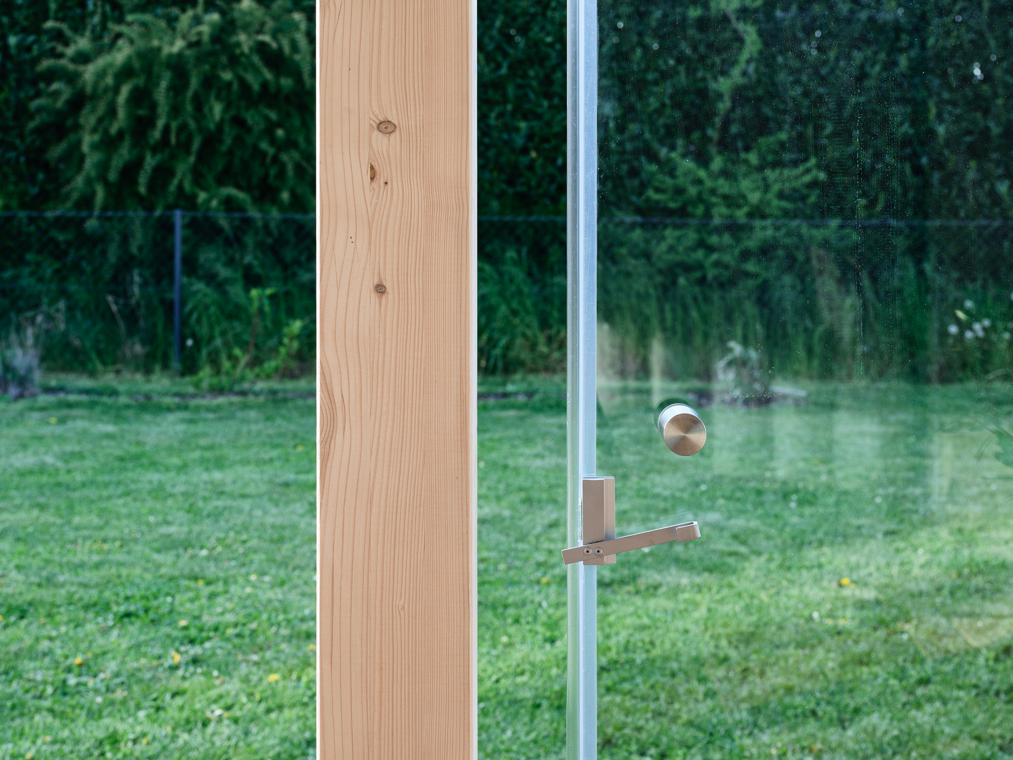 Entièrement vitrée, elle s’ouvre sur le jardin grâce à des panneaux coulissants tout autour. À l’intérieur, un plancher en ipé pour la chaleur, un plafond bois acoustique pour le confort, et un éclairage LED discret pour l’ambiance.