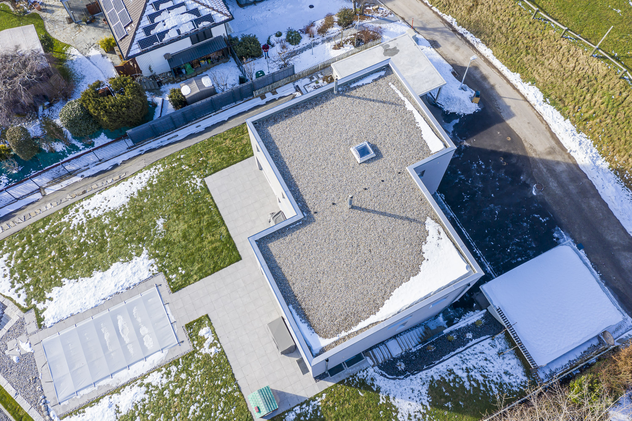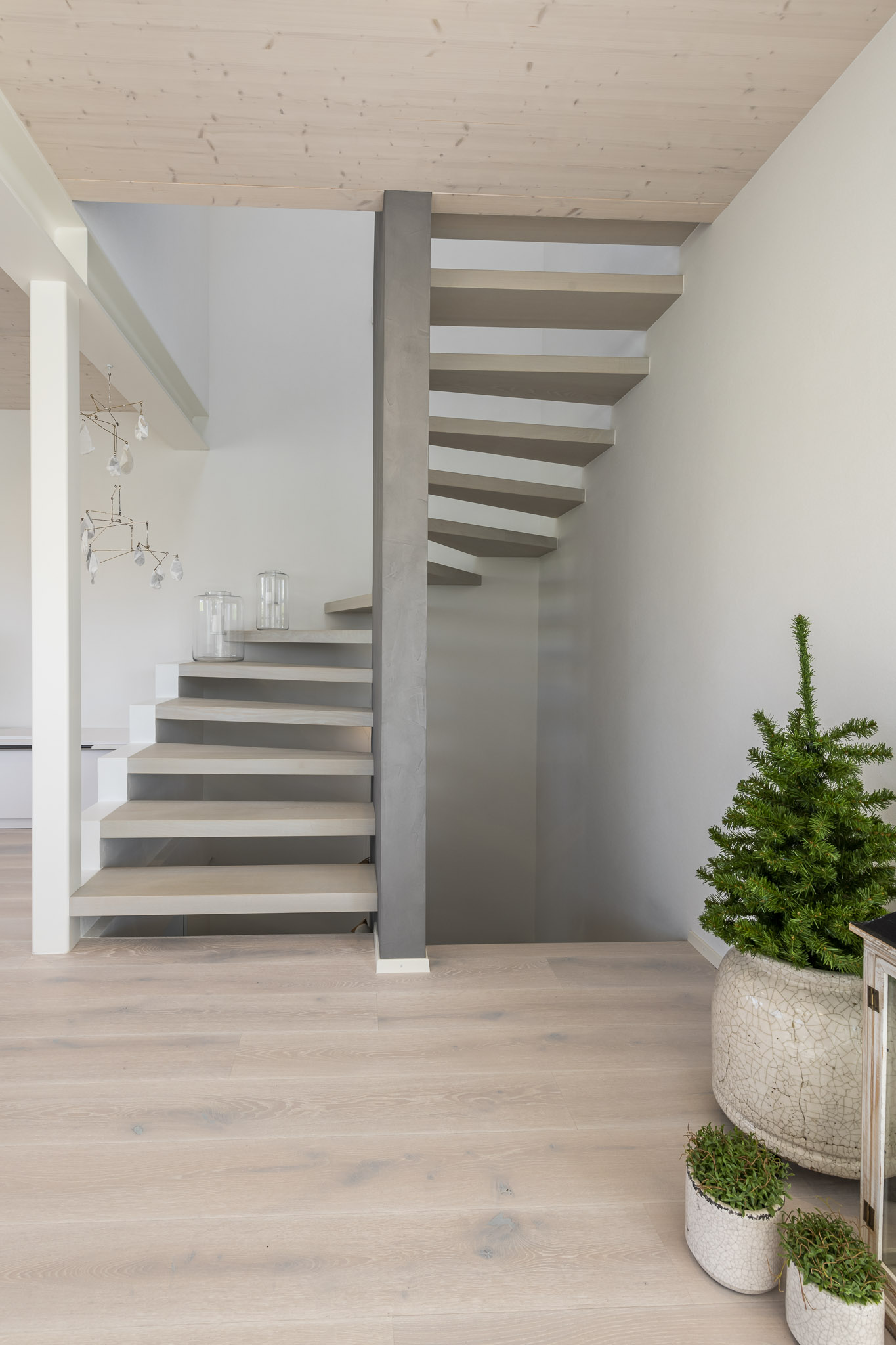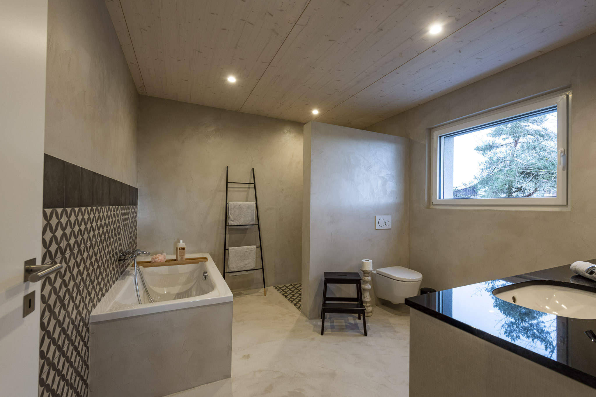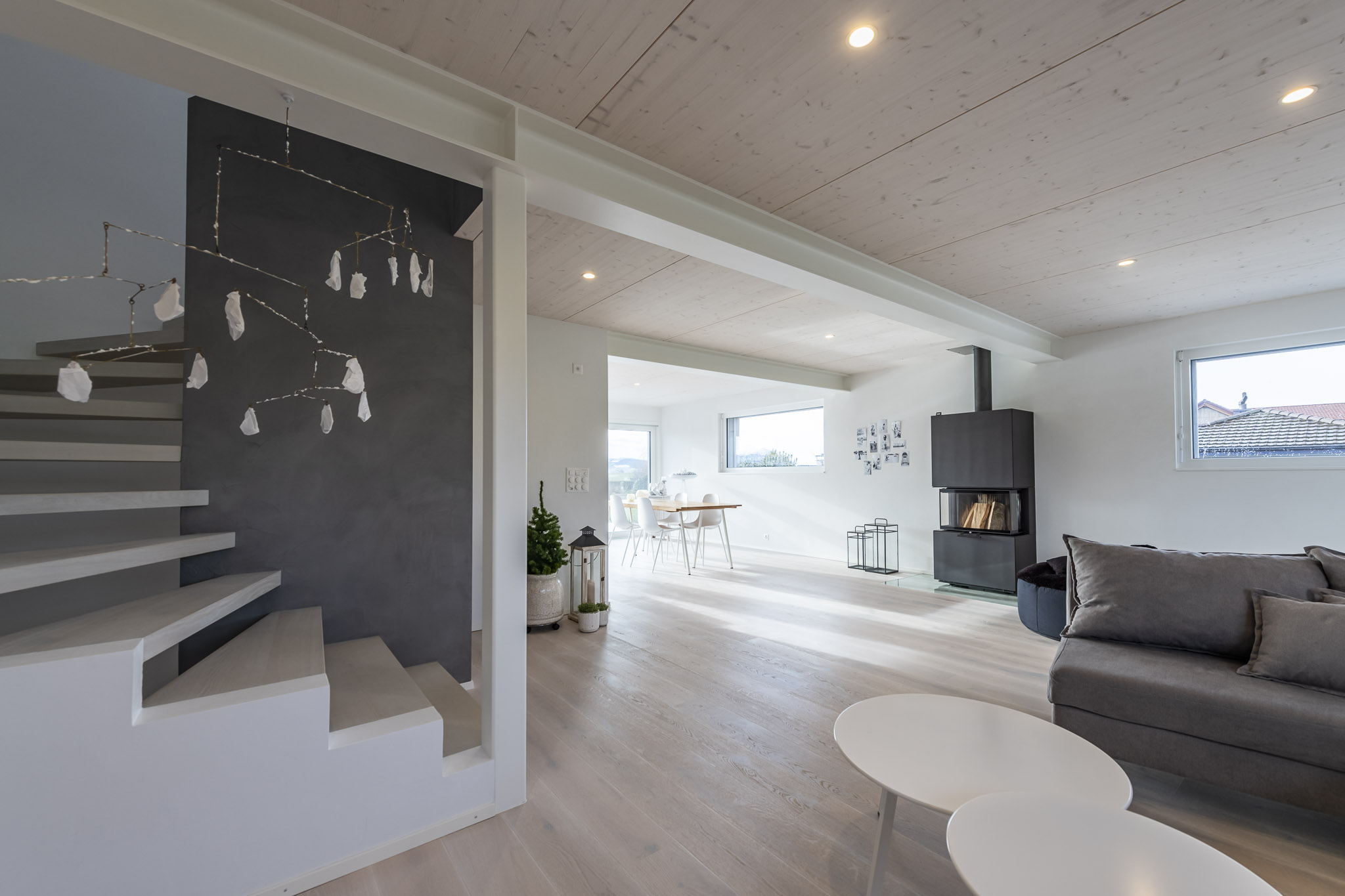 Cette villa jumelée se distingue par son aspect moderne et crépi, qui ne laisse pas deviner son ossature bois. À l’intérieur, seules les dalles et les escaliers en bois rappellent le matériau d’origine. Du projet architectural à la pose des fenêtres, cette réalisation illustre la diversité des solutions offertes par la construction bois.