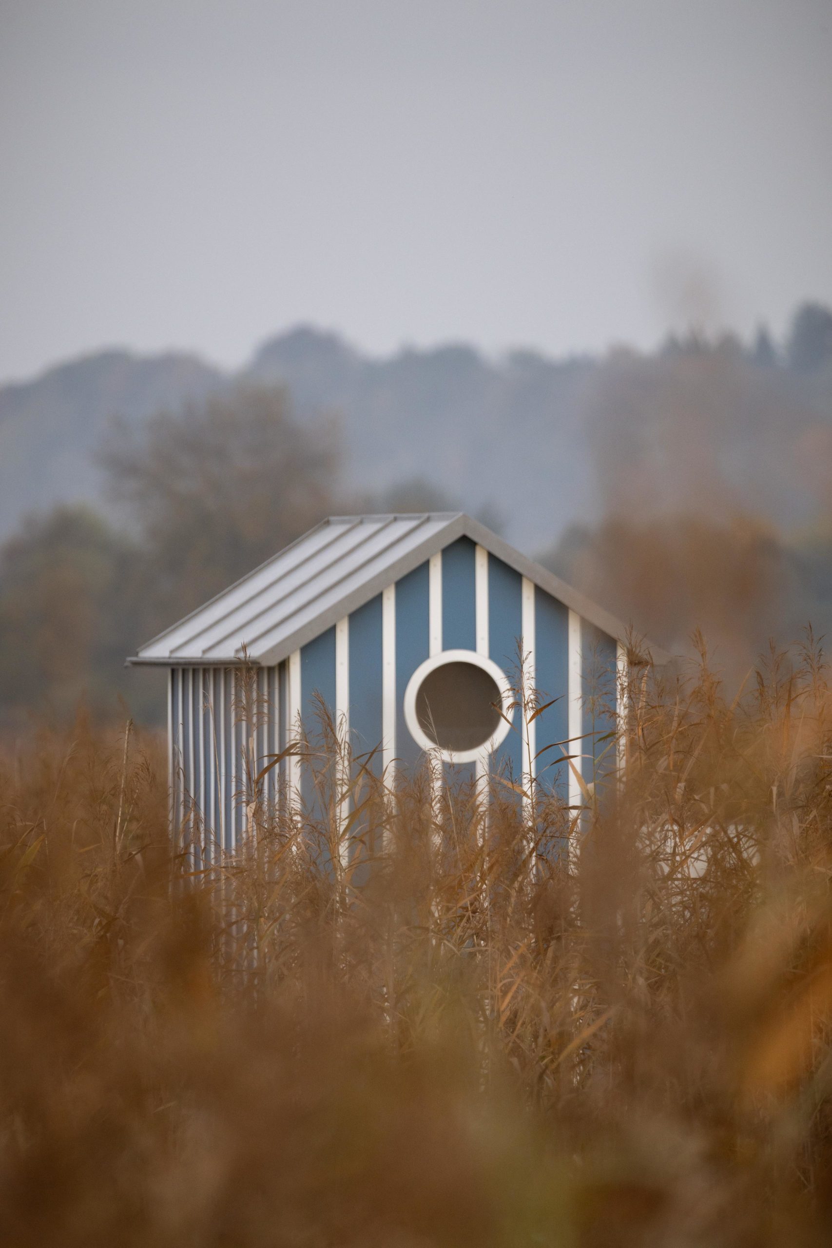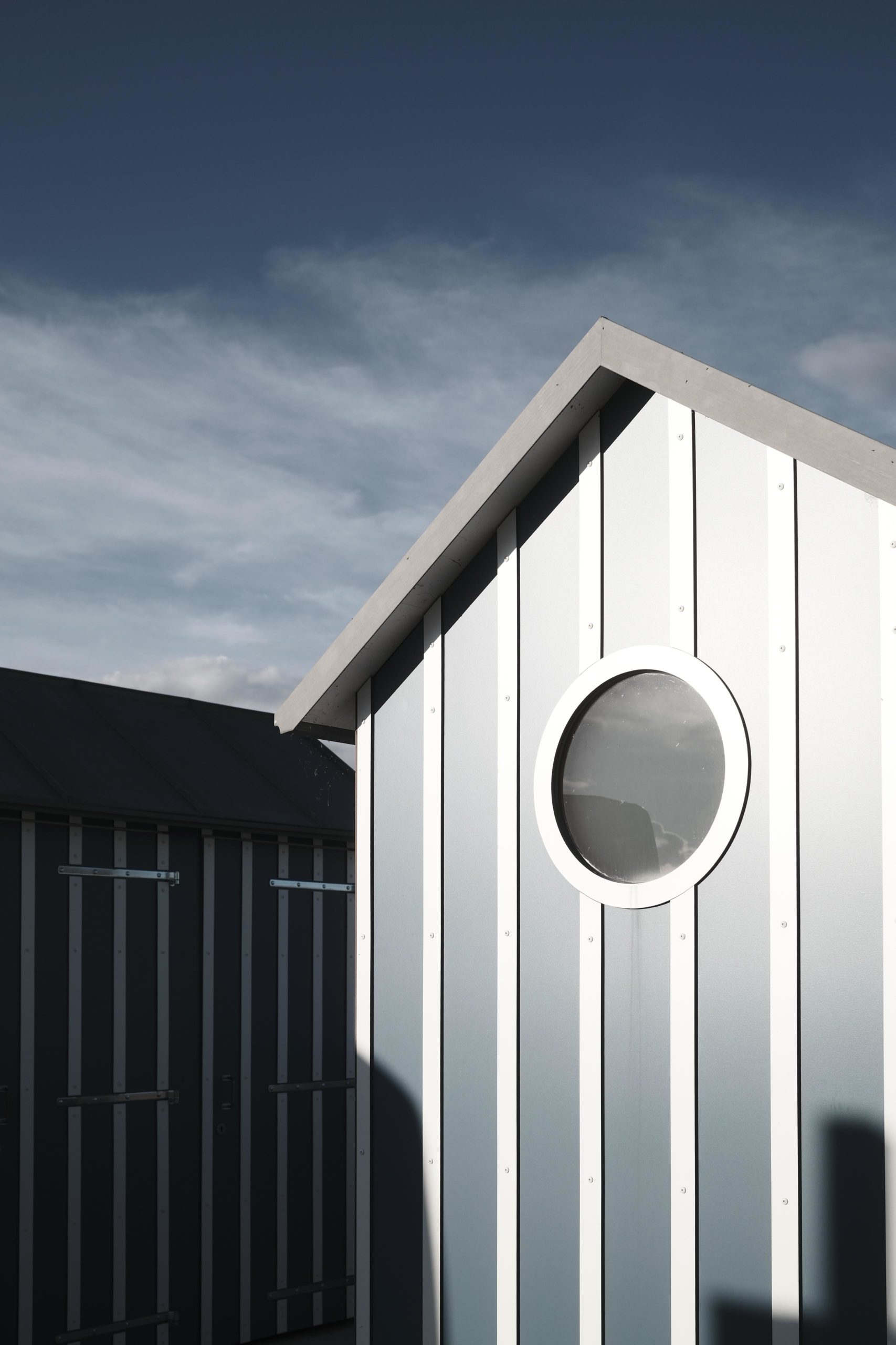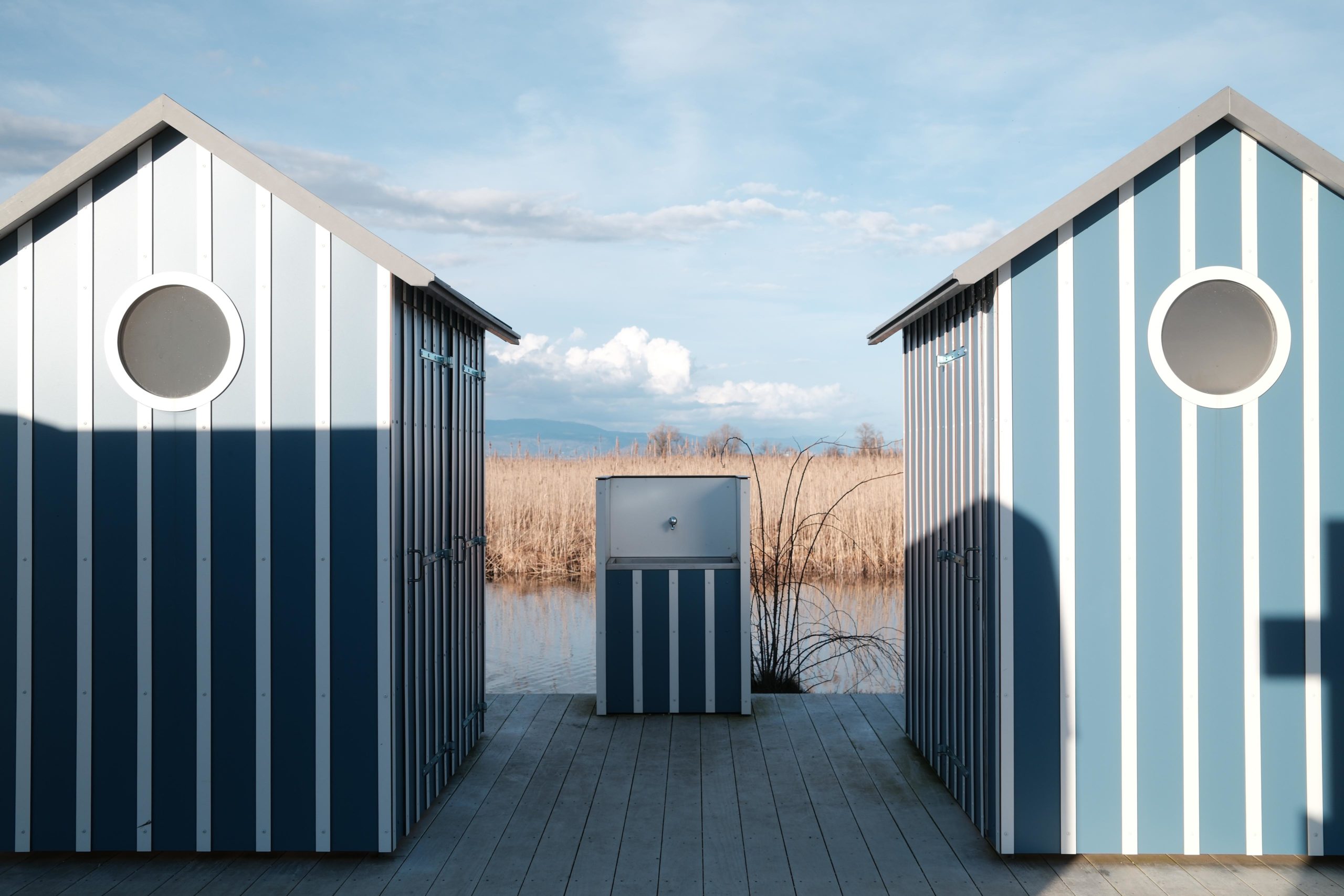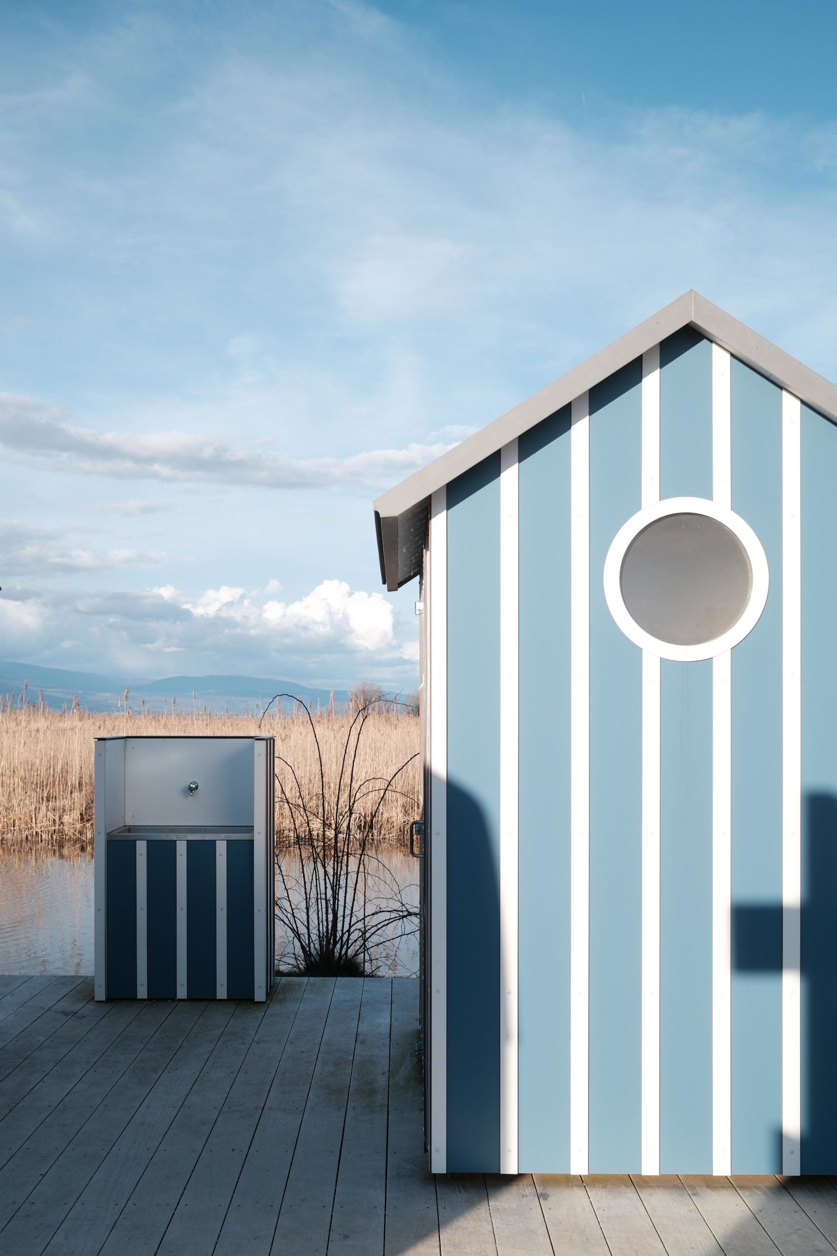 Le projet comprenait aussi la rénovation de deux cabanes de plage emblématiques, réalisées en panneaux HPL bleu et blanc pour garantir leur résistance et leur durabilité.