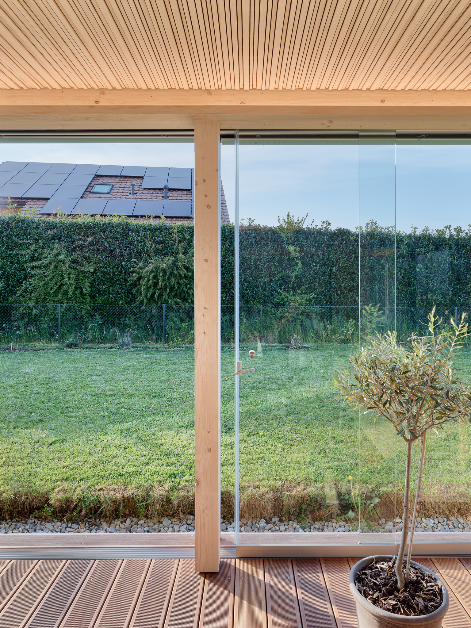 Entièrement vitrée, elle s’ouvre sur le jardin grâce à des panneaux coulissants tout autour. À l’intérieur, un plancher en ipé pour la chaleur, un plafond bois acoustique pour le confort, et un éclairage LED discret pour l’ambiance.