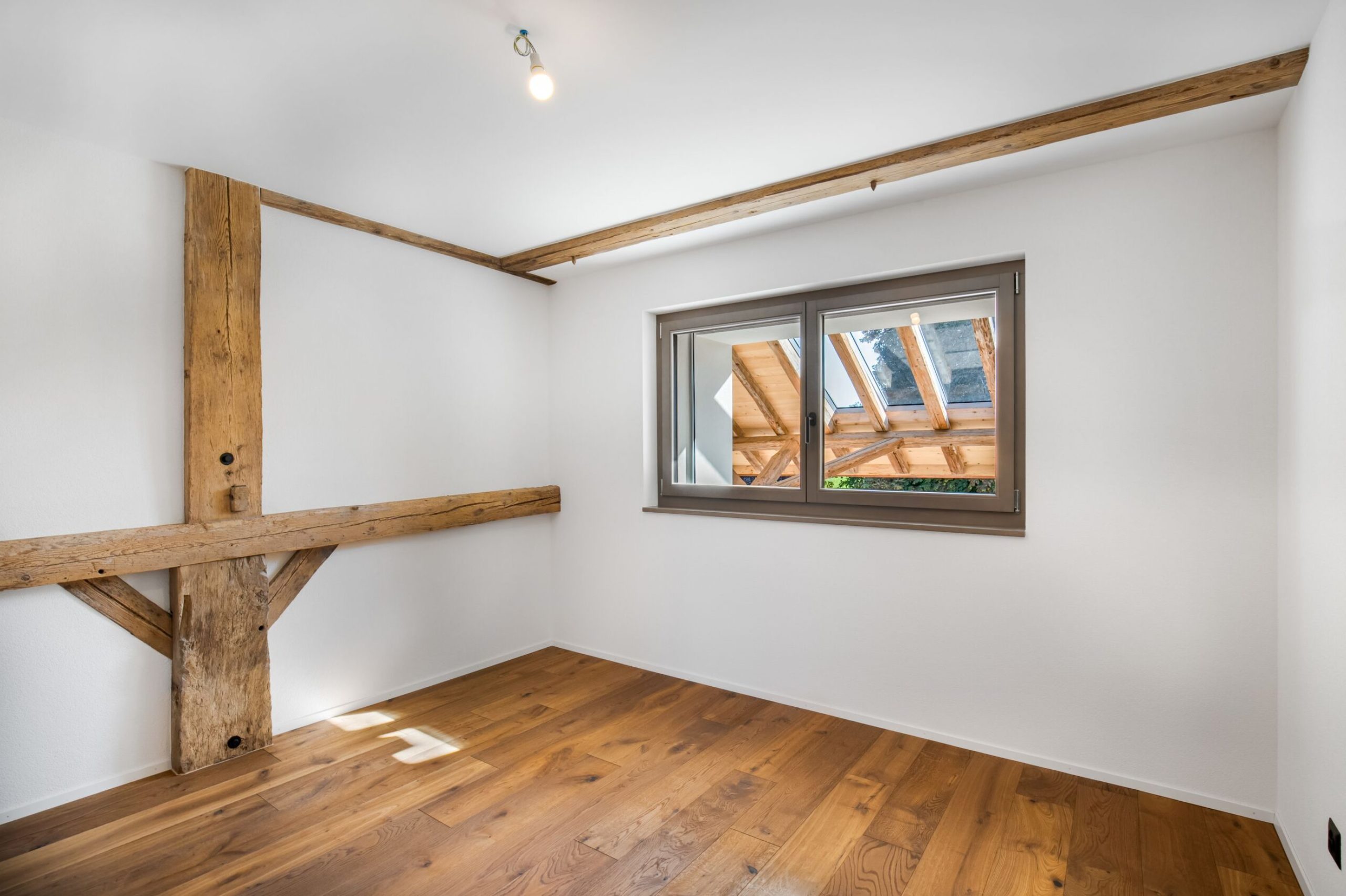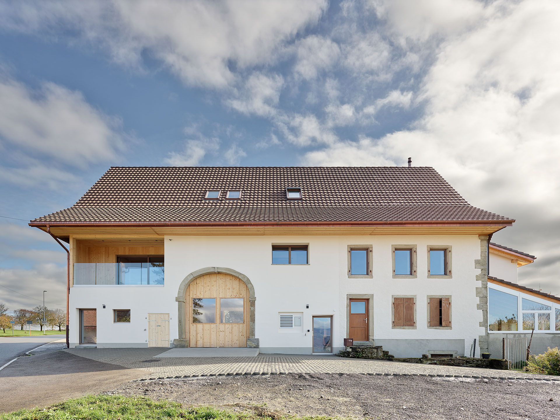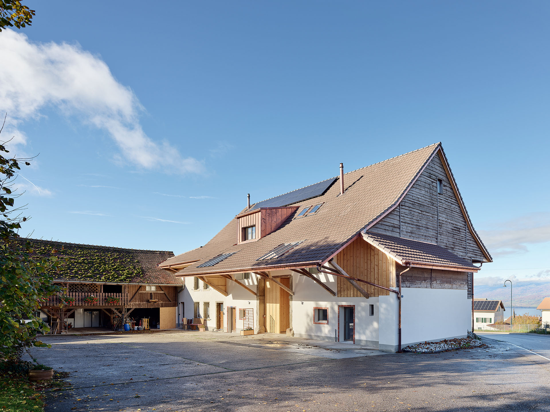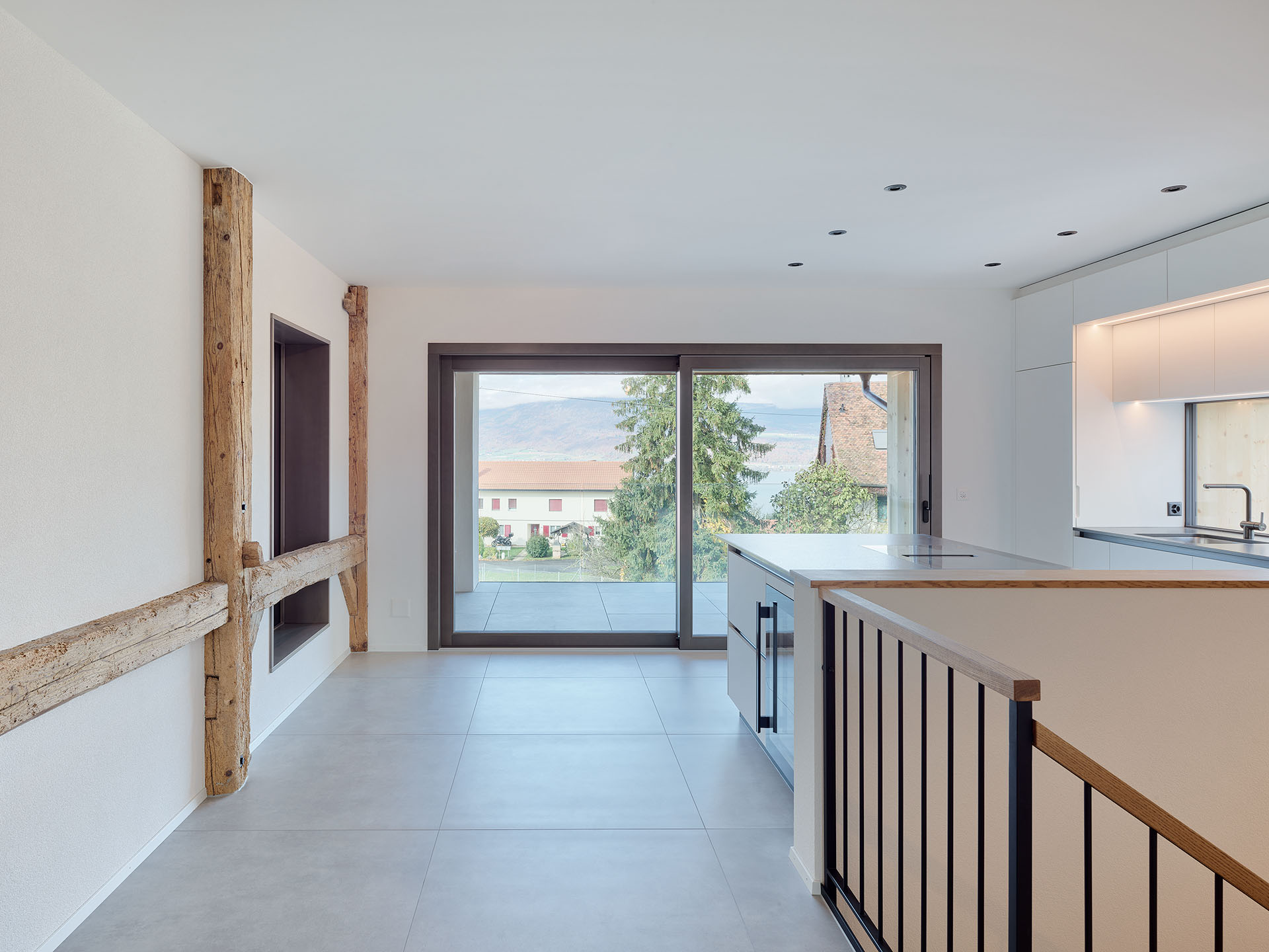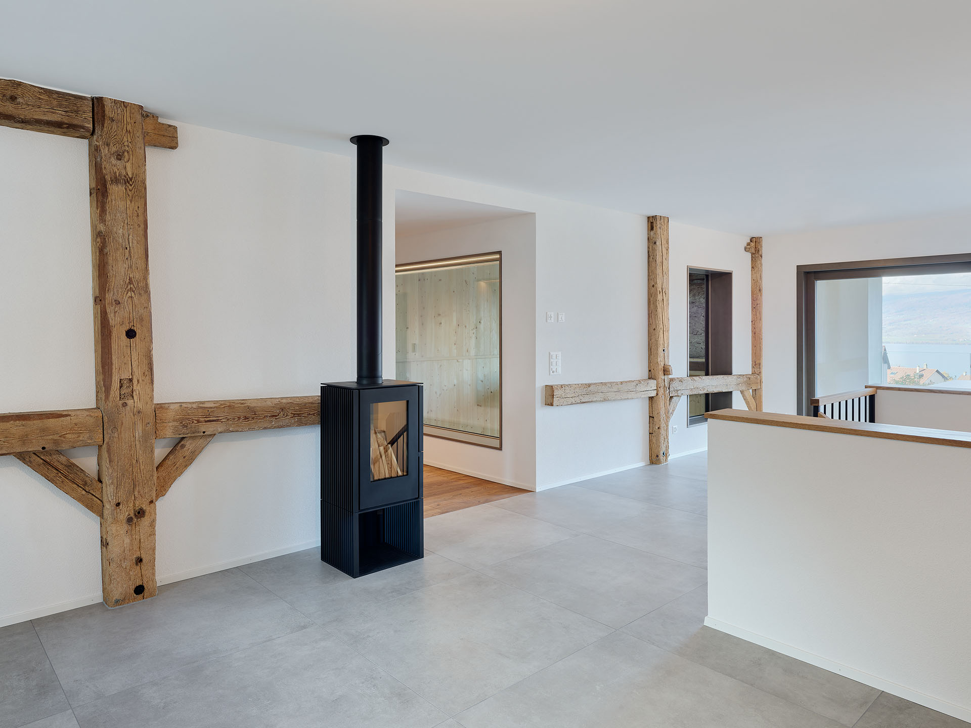 À Châbles, cette ancienne ferme a retrouvé vie à travers une rénovation complète, à la fois audacieuse et respectueuse du bâtiment d’origine. La toiture a été entièrement refaite, et l’intérieur accueille désormais un appartement en triplex où chaque détail reflète la qualité du travail artisanal.