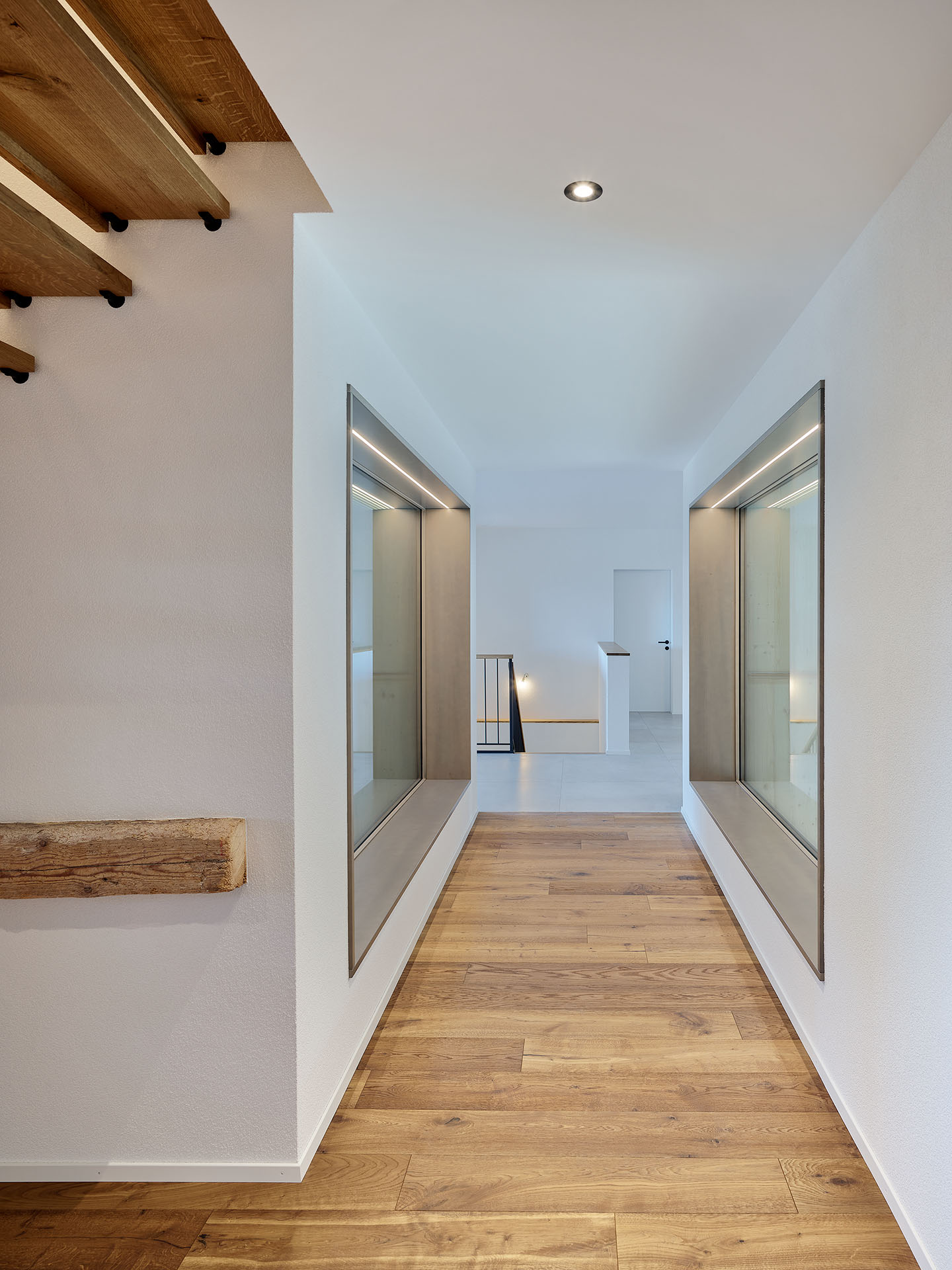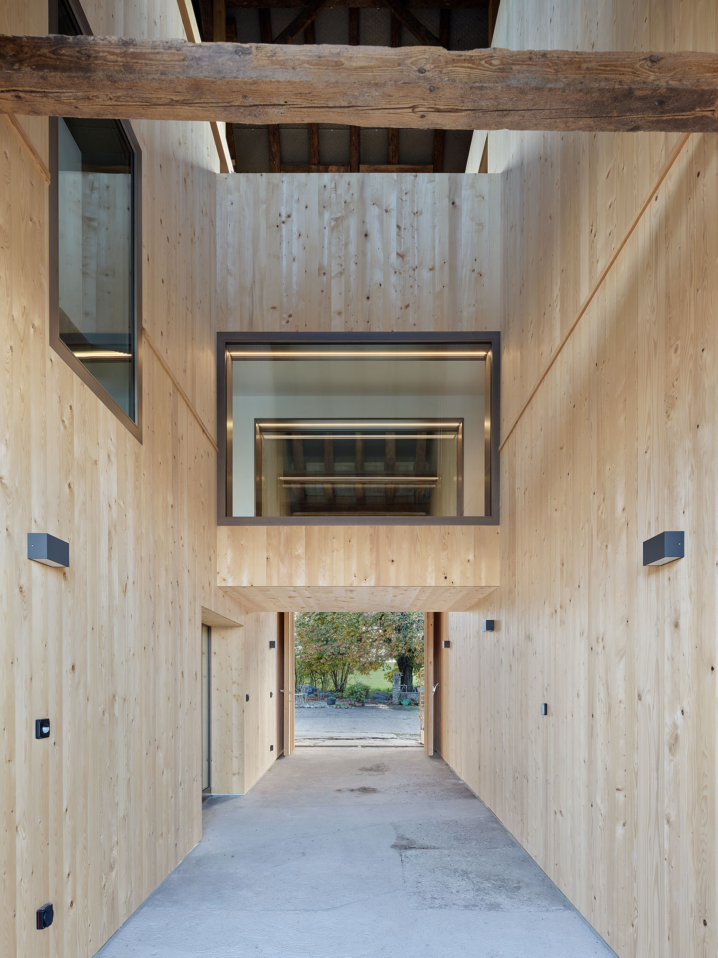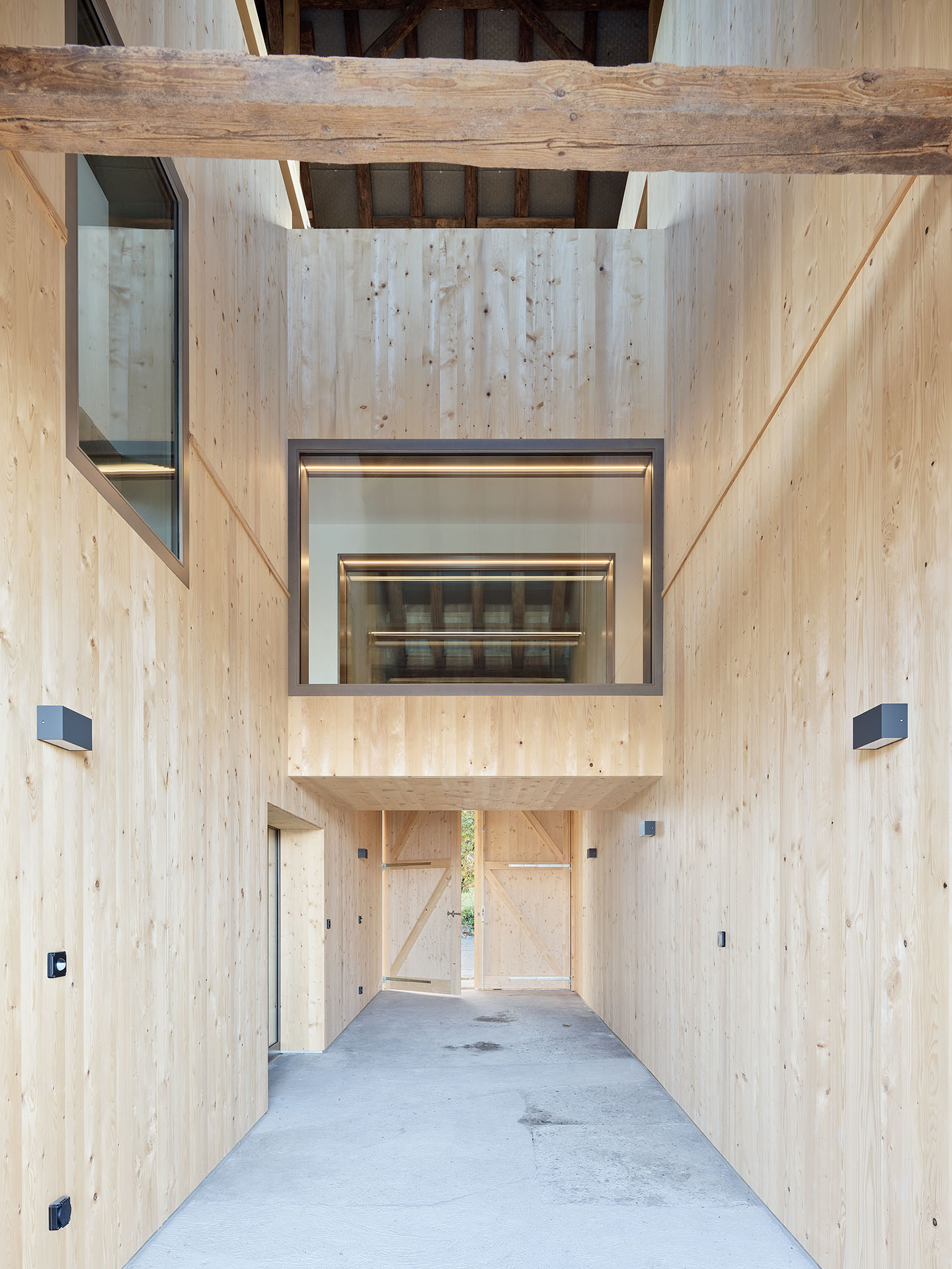 Une passerelle centrale relie les espaces de vie à la partie nuit, tout en offrant des vues ouvertes sur la grange et ses structures bois apparentes. La lumière circule librement, mettant en valeur la matière et la verticalité du lieu.