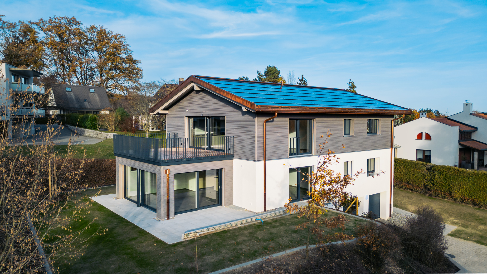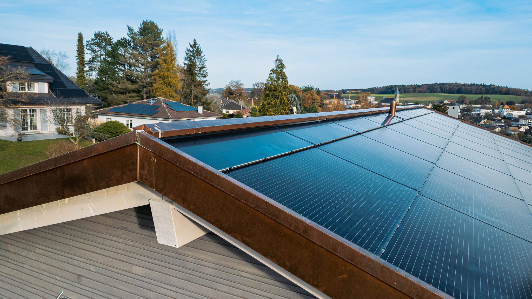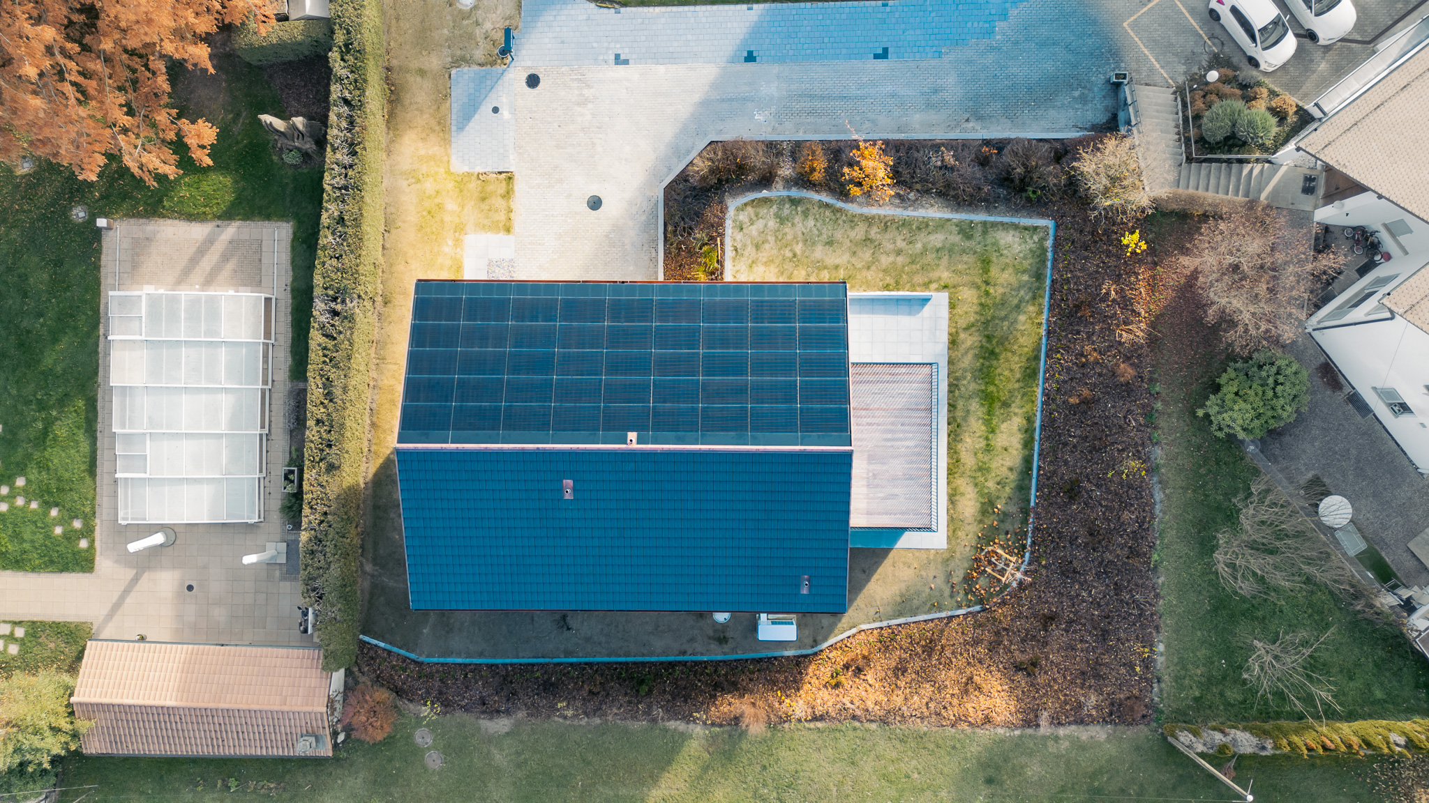 Sur le pan de toiture orienté plein sud, une installation photovoltaïque intégrée, couplée à des batteries de stockage, apporte une nouvelle dimension au projet — celle d’une maison plus autonome, tournée vers demain.