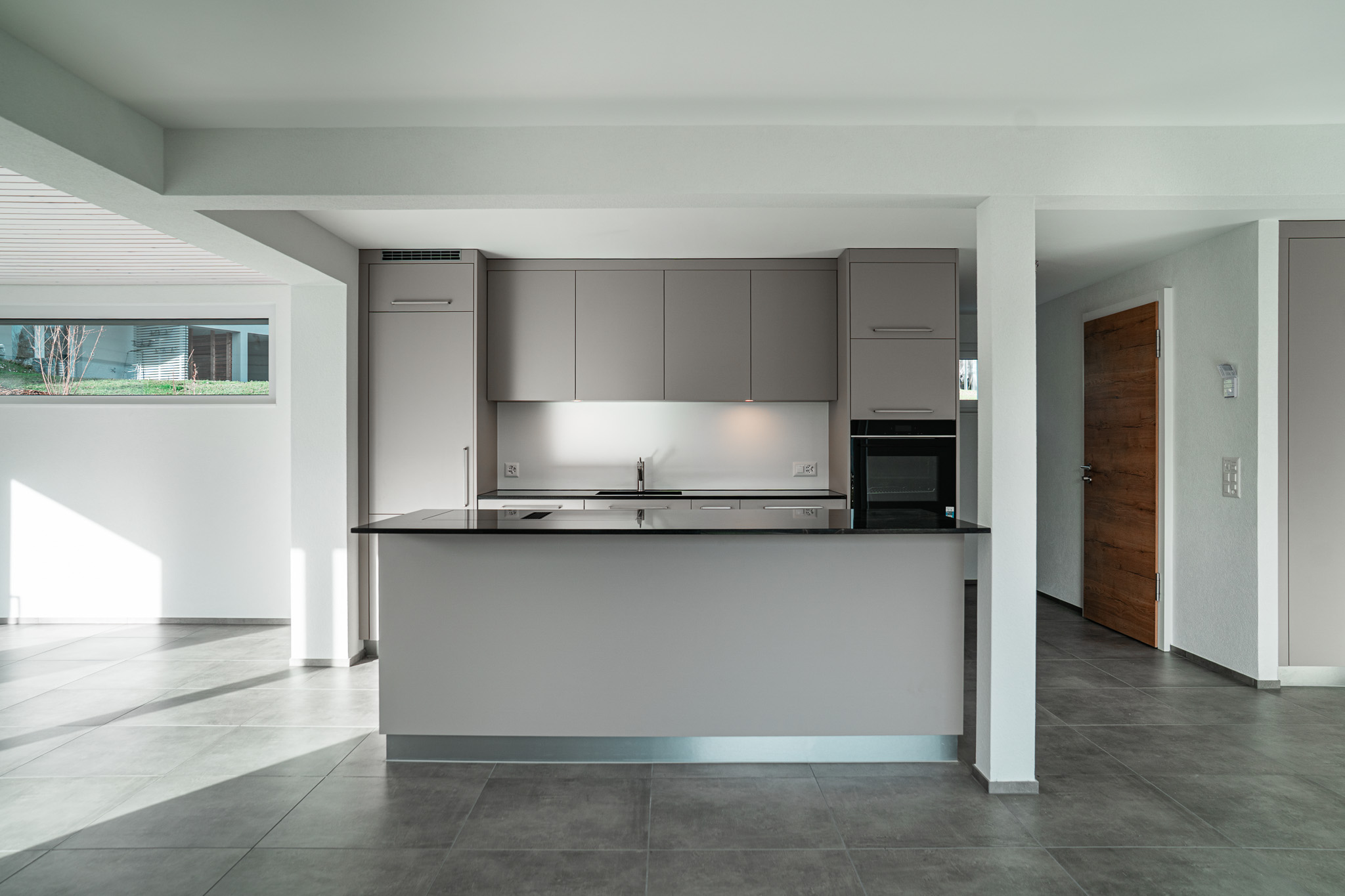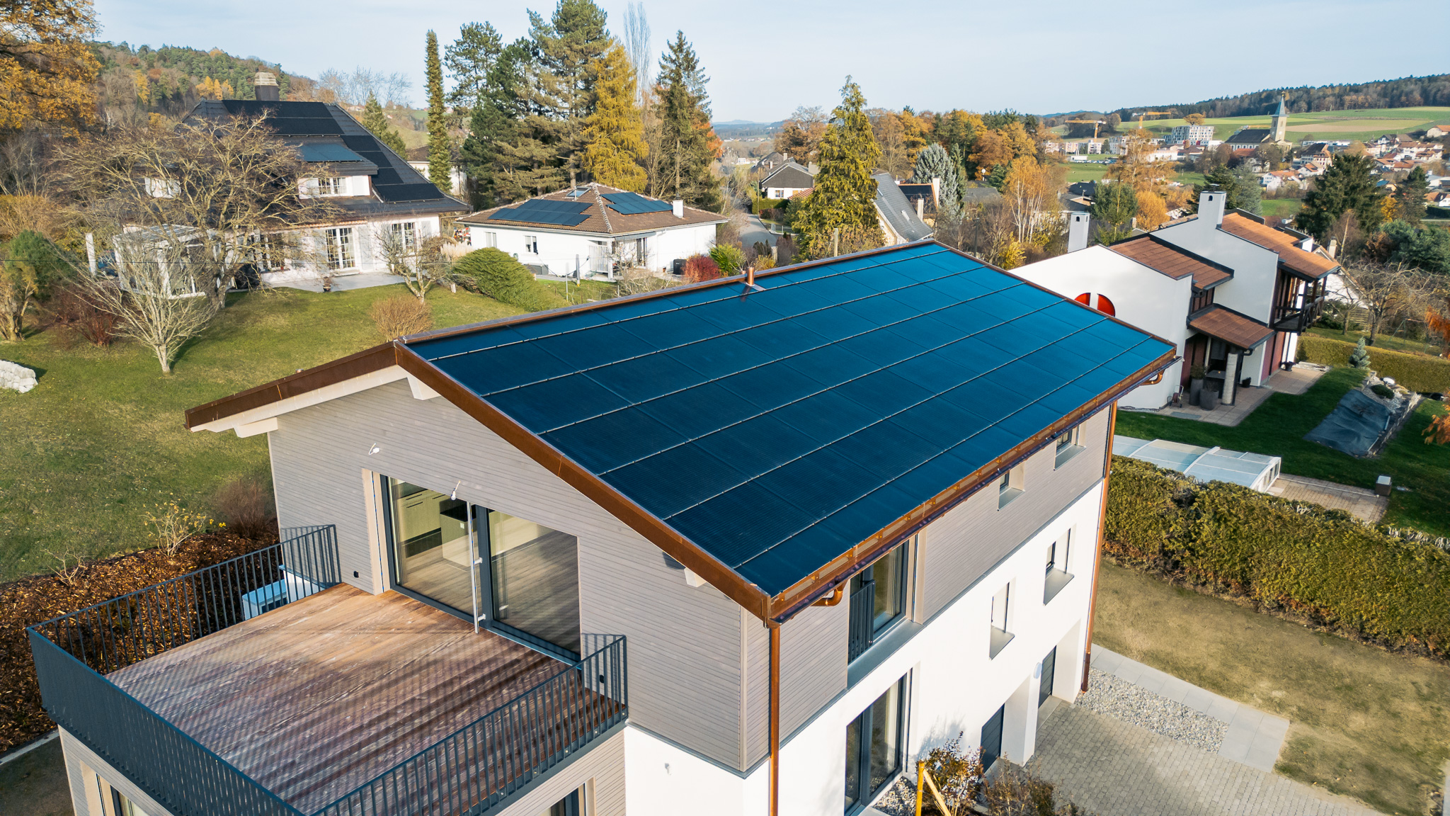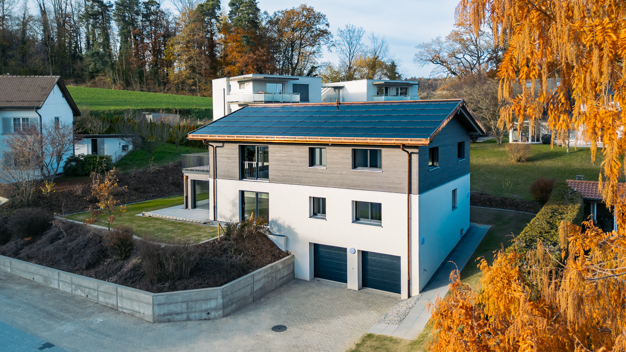 Sur le pan de toiture orienté plein sud, une installation photovoltaïque intégrée, couplée à des batteries de stockage, apporte une nouvelle dimension au projet — celle d’une maison plus autonome, tournée vers demain.